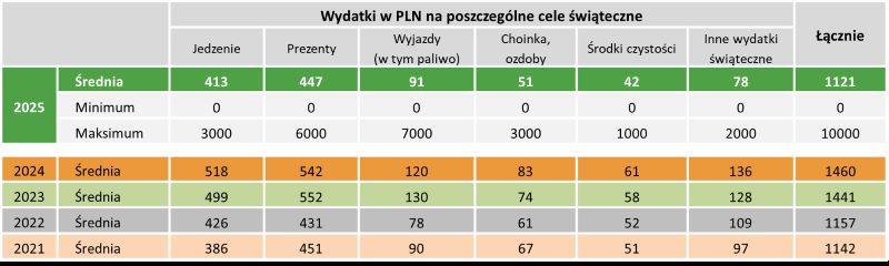W porównaniu do roku ubiegłego, kwota przeznaczona na prezenty świąteczne spadła o 18 proc., a wydatki na jedzenie zmniejszyły się o ponad 21 proc. Rozpiętość wydatków jest duża – od 0 zł (osoby deklarujące, że nie wydadzą nic na dany cel) do nawet 7000 zł.